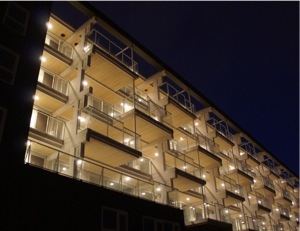 ’s Avonds ontstaat er een mooi ‘lichtspel’ in de gevel. Deze is ontworpen door architect Naud Schroeder.